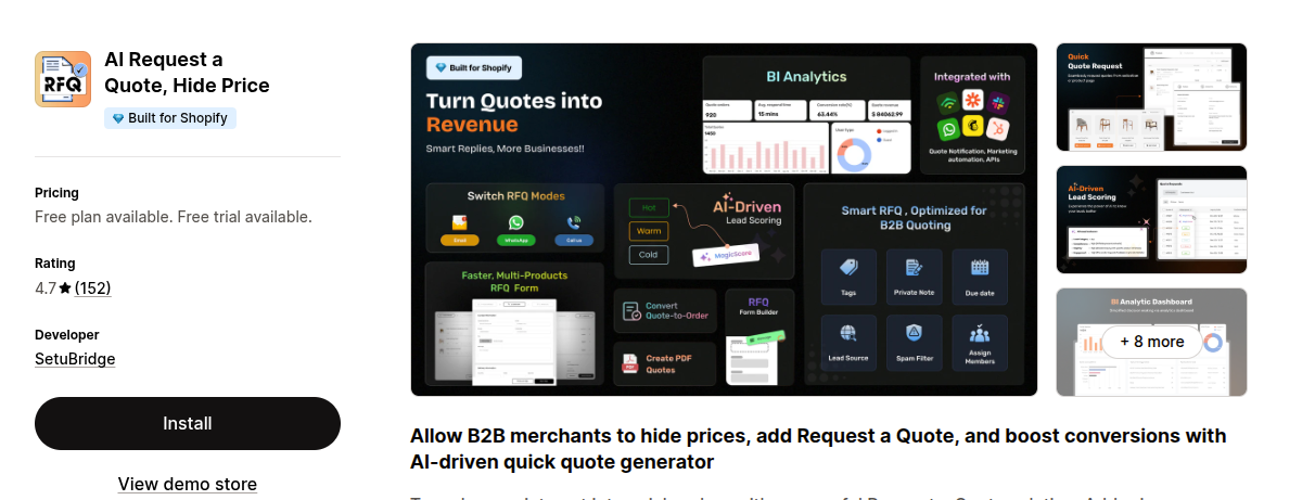 With support for multi-item quote forms, WhatsApp-based quotes, customizable PDF generation, and AI lead quality scoring, AI Request a Quote equips merchants with deeper visibility into how enquiries are sourced and processed. Its business intelligence dashboard and quote stage tracking enable clearer reporting and internal organization, while features like quote chat, tags, private notes, and integration with third-party tools help maintain rich context throughout the quoting lifecycle. This combination of automation, tracking, and structured management makes AI Request a Quote a strong choice for merchants who want to enhance enquiry quality, improve operational insights, and manage complex quote pipelines with greater control.